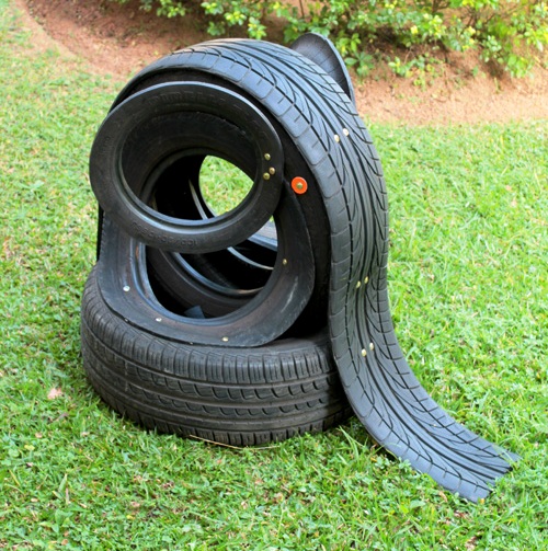 Este Elefante é produzido com pneus de carro de passeio e moto e acabamento com mangueiras coloridas. Além do uso para brincadeiras tanto infantil quanto adulto, pode ser usado para exercícios físicos.
